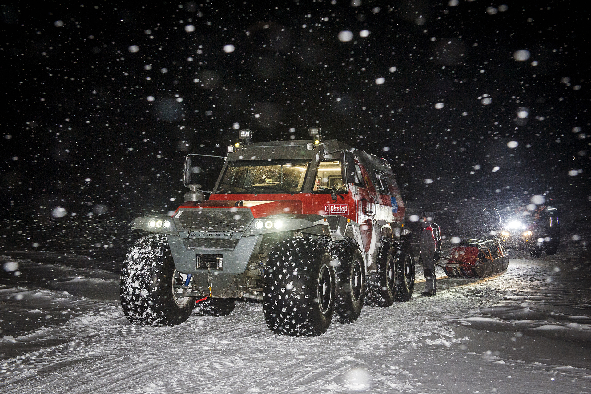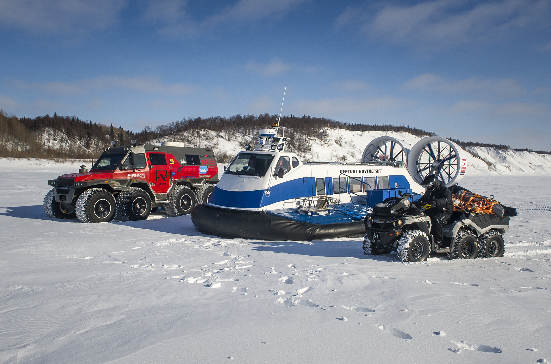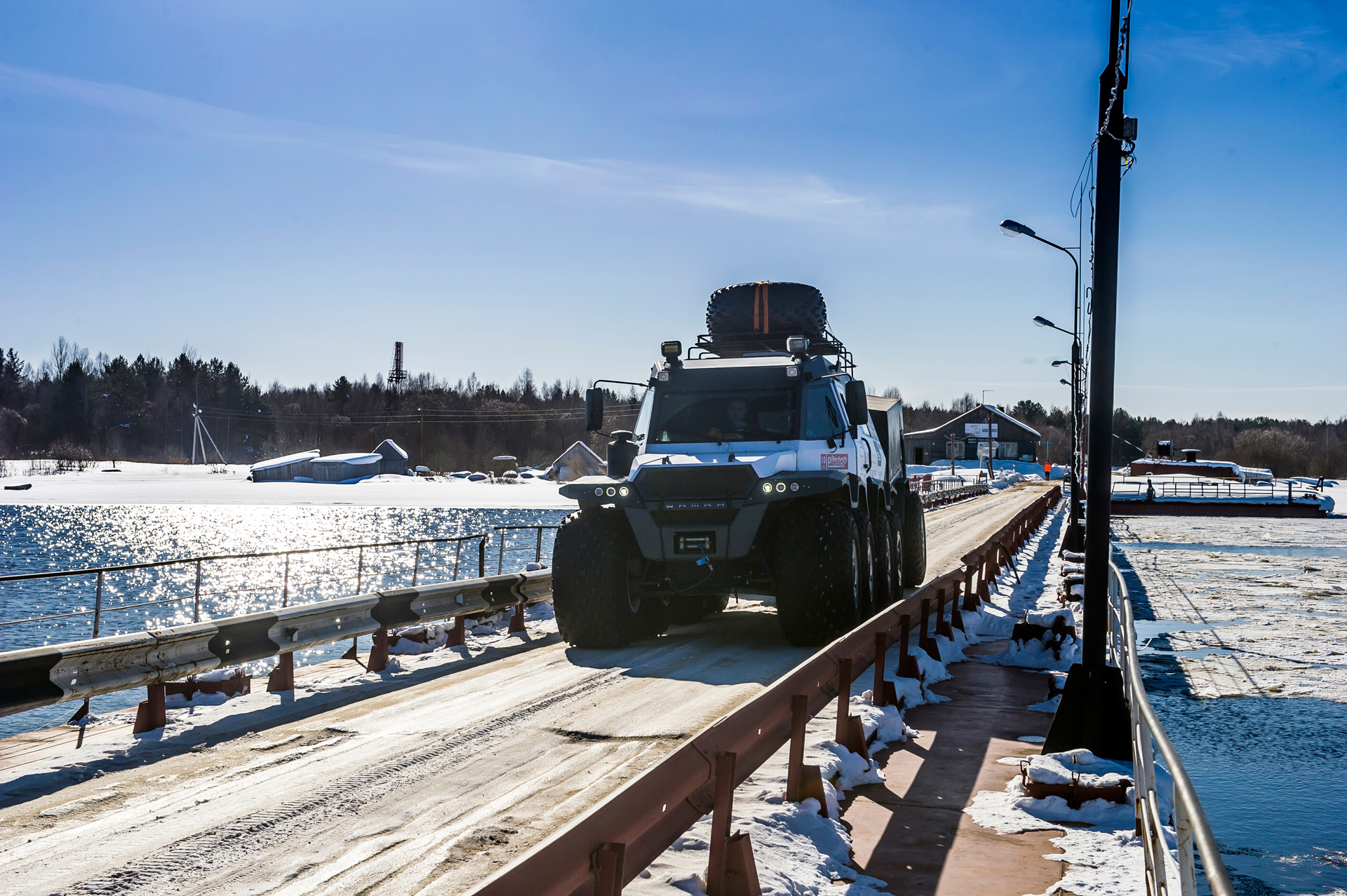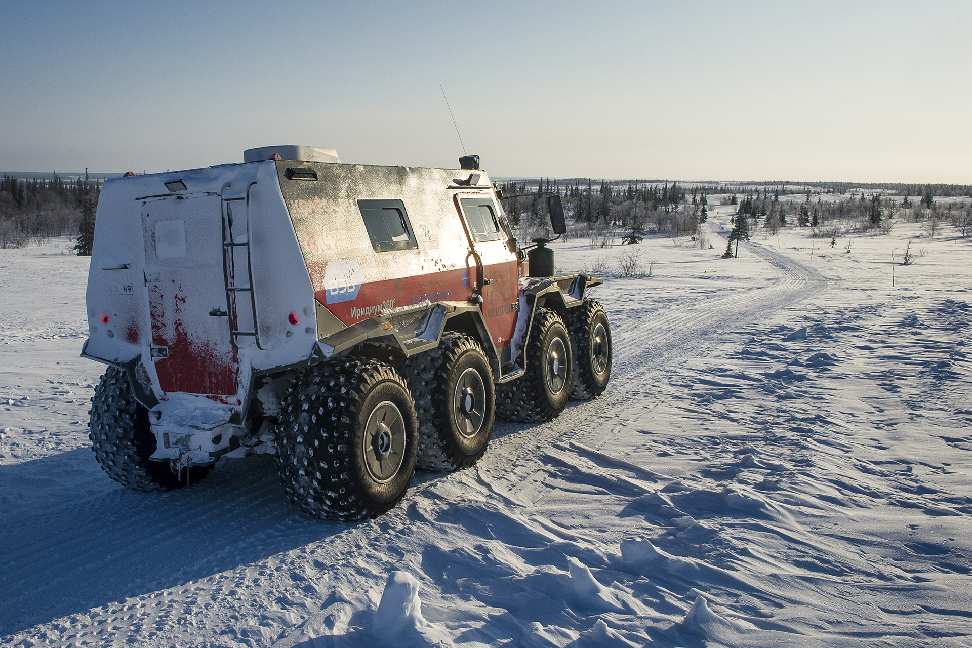 The first hundred kilometers we traveled in a strong snowstorm, snow swept the road and covered the windshield, the wipers were freezing, but after Bezhetsk the weather improved. In Vologda Region, the roads were covered with ice, but all-terrain vehicles rode along them quite confidently, thanks to the the weight of the cars and the number of wheels. The motorcade was headed by Pavlov’s “tadpole”, followed by a crew of mechanics, and a crew of journalists closed a small motorcade. We were driving together, although not fast: cruising speed was about 55-60 km /h. There were still more than 1,000 km ahead - the expedition was still at the very beginning.