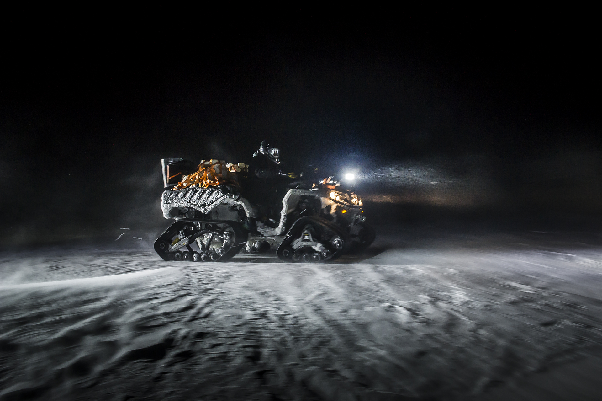 We moved along the "snowstorm" trail rolled by snowmobiles. Before the village of Nes, the traffic was quite active, but after, before Shoyna, its intensity dropped. Shaman went perfectly, which was not surprising with such wide wheels in the amount of 8 pieces. Yevgeny Pavlov was riding a quad bike on wheels, and also coped with the task. At times, he went far ahead, and told us that the maximum speed that day was around 75 km/h. Snowmobiles, by the way, can reach 100 km/h, if it is, of course, Yamaha. In the dark - and most of the way you have to go in the dark - the road is traced by the landmarks with reflective marks, and in general in the light of powerful headlights the track is visible quite well. Next day we continued our way to Canin Nos.