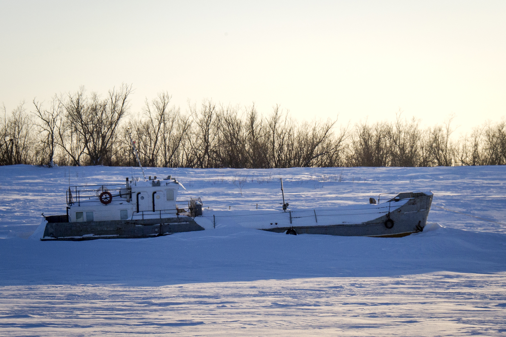 The previous day we spent in Kamenka, a workers’ village on the other bank of the river Mezen, opposite to the one, where the town of Mezen is situated. On March 10 in the morning we checked all the equipment. We took the tracks from the quad bike and put them on the Shaman’s trunk, and this played a cruel joke with us: after 30 kilometers, when we finally drove off, the trunk was broken. But a solution was found: we took a flat-bottomed sledges for hire from a fellow traveler on a snowmobile, and put the tracks and some gasoline in it. The rest of the things from the trunk we had to put to the Shaman's salon. In the lack of space, we kept on moving towards the goal - Canin Nos.