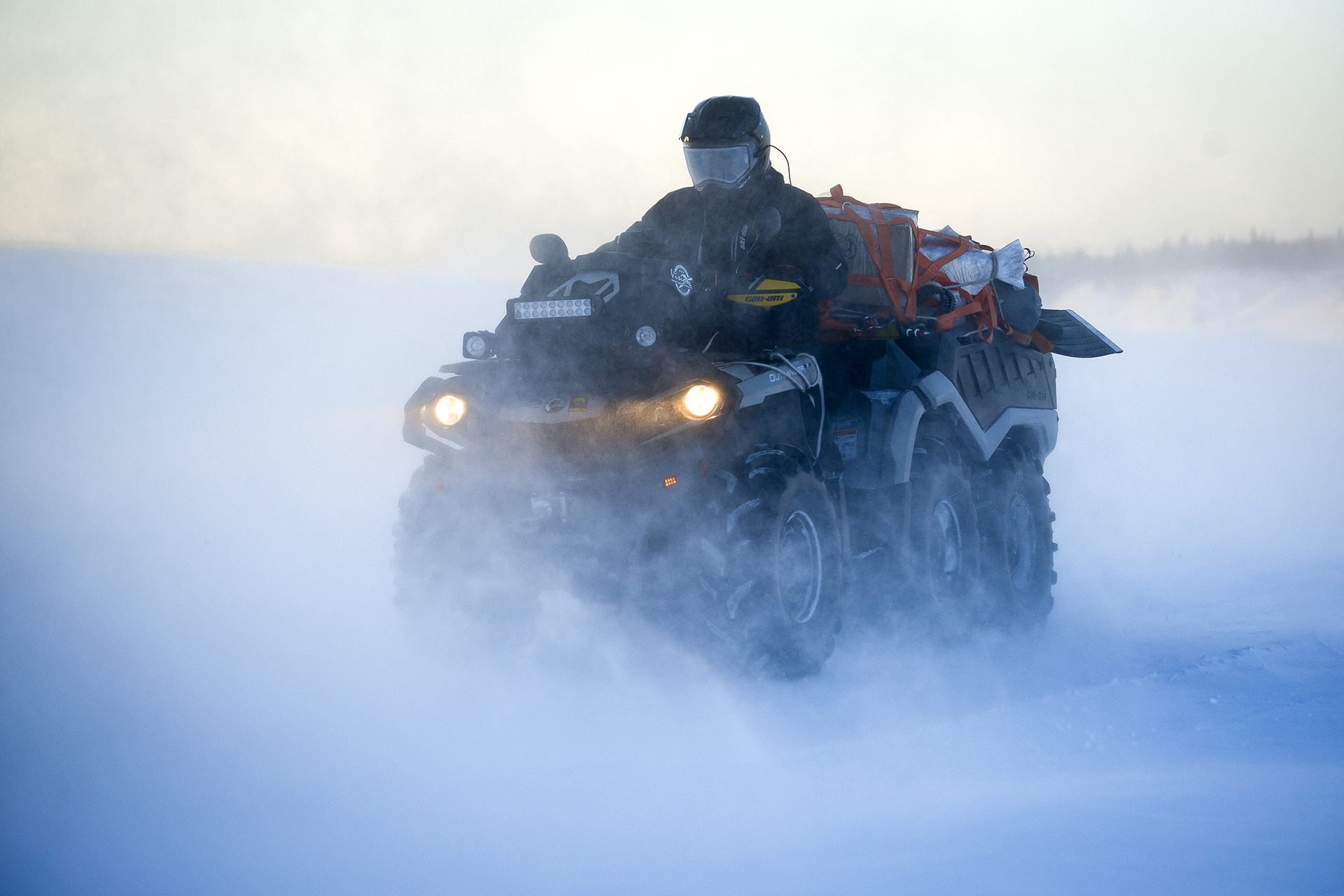 In Shoyna the team had to stay for half a day instead of an hour or two, as it was originally planned. The reason was a breakdown of a quad bike. The variator belt should last for a long time, but when riding on the tracks, the transmission load is much higher than on wheels, so the belts are easily broken. That was the third broken belt for the trip, and the last one of the spare belts remained in Kamenka. The spare belt should have been brought by a passing snowmobile. But still we waited for a long time. Finally we got the spare belt, fixed the quad bike and drived on, as the night was just around the corner.